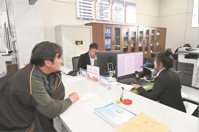 11月14日,在黃南藏族自治州澤庫縣社會治安綜合治理中心,敞亮整潔的辦事大廳里,當地群眾正在一體化開放式的受理窗口辦理業務。