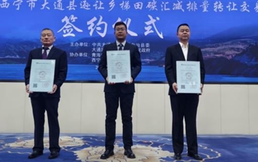 青海新聞網·江源新聞客戶端訊 12月4日,大通縣遜讓鄉梯田碳匯減排量首單交易簽約儀式順利舉行,標志著全國首單水土保持項目碳匯交易正式落地。此次交易依托遜讓鄉1.8萬畝梯田產生的7.01萬噸凈碳匯量,達成1.1萬噸交易,交易金額達66萬元。