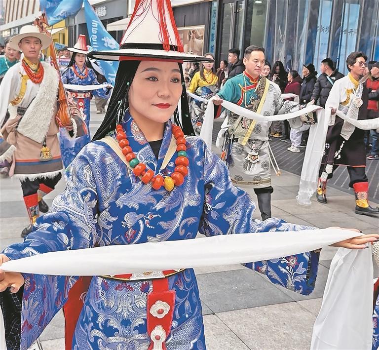 服飾巡街更是將氛圍推向高潮,身著安多藏族服飾的演員們緩緩走過廣場,鮮艷的色彩與精美的紋樣引得路人紛紛駐足,大家湊近觀察服飾上的刺繡,小聲交流著對(duì)民族文化的好奇。