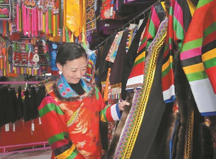 在互助縣城最繁華的地段,我租下了這個上下兩層、90平方米的鋪面。一樓的墻上掛滿了五彩繽紛的服飾,從彩虹袖到繡花鞋,從頭飾到腰帶,一針一線都是我的心血;二樓則放著各色布料、五顏六色的繡線和兩臺縫紉機。憑著這家店,我第一年就還清了貸款。