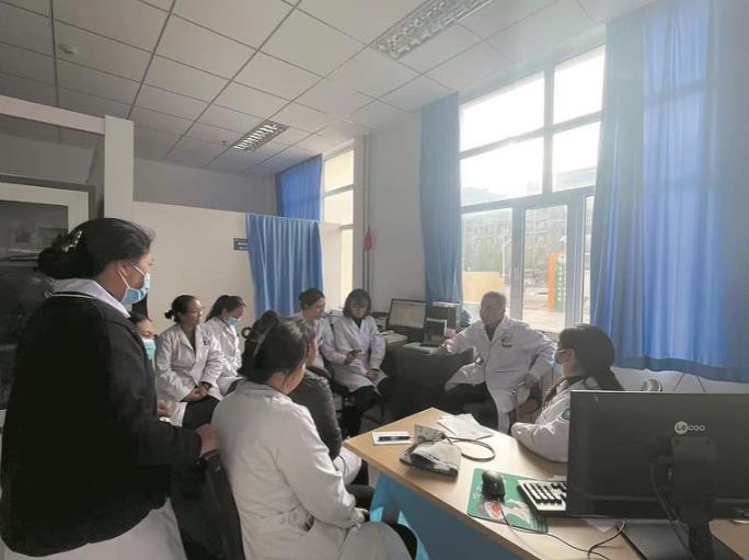 在囊謙縣人民醫院的遠程會診中心內,梁海峰正帶著院里的骨干醫生與首都醫科大學附屬復興醫院進行一場跨越千里的“云端”培訓。培訓結束后,顧不上休息,梁海峰又快步來到內科診室,此時門外已有很多等候的患者。