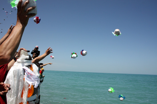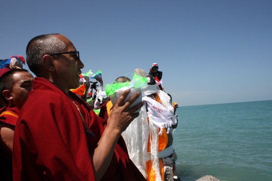 湖畔牧民群眾爭相把寶瓶投入青海湖中,祈愿人與自然和諧共存。本網記者崔永燾攝