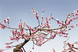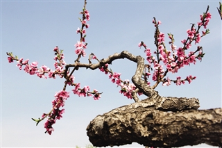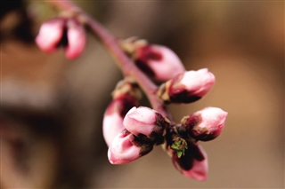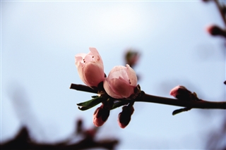 當(dāng)我們走進桃花園內(nèi),便看到一樹樹桃花含苞待放、壓滿枝頭。到底是早了幾日,但單看那末開的花蕾嫣紅小巧,便可以想象出滿園桃花似錦的景象。一束束含苞欲放的花蕾,站在青紅色的枝頭上,似點染上猩紅的胭脂扣,遮住了繁枝。其間,零星的、迎風(fēng)綻放的花兒粉嫩嫩的,攢動著張張玲瓏嬌艷的臉龐,充滿了柔情蜜意,讓人百看不厭。