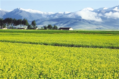 一派震撼人心的農地勝景,使站在我身旁的親家好友——他正是門源人,也興高采烈像個導游似地解說起來:改革開放以來,這兒重科學種田,油菜花幾經選優,以“個矮、早熟、抗逆”名聞遐邇,畝產由昔日的30公斤增到150公斤,翻了好幾番,含油率已高達42%至48%。這里的油菜花不用農藥,不受污染,保持原汁原味,所以特受歡迎……只見他如數家珍,說得眉開眼笑,掩不住對自己家鄉的熱愛之情。