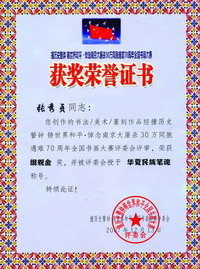 其作品曾多次參加全國(guó)書展并獲獎(jiǎng)。如:在“撞歷史警鐘,祝世界和平”和“獻(xiàn)給祖國(guó)、獻(xiàn)給母親”中國(guó)書畫名家大展中分別獲金獎(jiǎng),在“唐宋杯”、“醴泉銘杯”全國(guó)書畫大賽中獲銀獎(jiǎng)。作品已編入《中國(guó)書畫藝術(shù)作品選集》、《中日邦交正常化三十周年書畫集》、《當(dāng)代書畫藝術(shù)家精品大典》、《二十一世紀(jì)中國(guó)知名書畫藝術(shù)家墨跡選》等。并被《中國(guó)書法家作品選集》編委會(huì)授予優(yōu)秀藝術(shù)家等榮譽(yù)稱號(hào),許多作品已在國(guó)際互聯(lián)網(wǎng)上展示,有的作品還被日本、美國(guó)、澳大利亞、加拿大等國(guó)友人收藏。2004年中華人民共和國(guó)人事部中國(guó)人才研究會(huì)藝術(shù)家學(xué)部委員會(huì)授予“杰出藝術(shù)家”稱號(hào)。