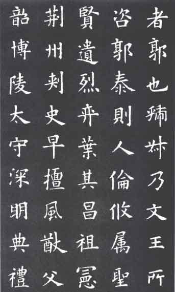 九成宮醴泉銘:魏征撰,歐陽詢書,記載唐太宗在九成宮避暑時發現泉水之事。碑立于唐貞觀六年(632)。此碑用筆方整,且能于方整中見險絕,字畫的安排緊湊勻稱,間架開闊穩健。明陳繼儒曾評論說:“此帖如深山至人,瘦硬清寒,而神氣充腴,能令王者屈膝,非他刻可方駕也!泵髭w涵《石墨鐫華》稱此碑為“正書第