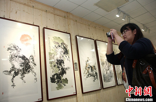 5月18日,《甲午馬年全國畫馬邀請展》在青島西海岸藝術館舉行,該展匯集了近百幅以馬為主題的中國畫作品,展示了畫家共同的藝術追求----以筆墨傳承中國文化,表現龍馬時代精神。中新社發 徐崇德 攝