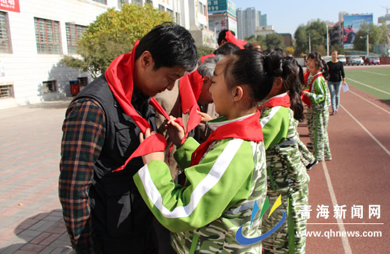 少先隊(duì)員代表向各位書畫家獻(xiàn)上紅領(lǐng)巾最崇高的敬意